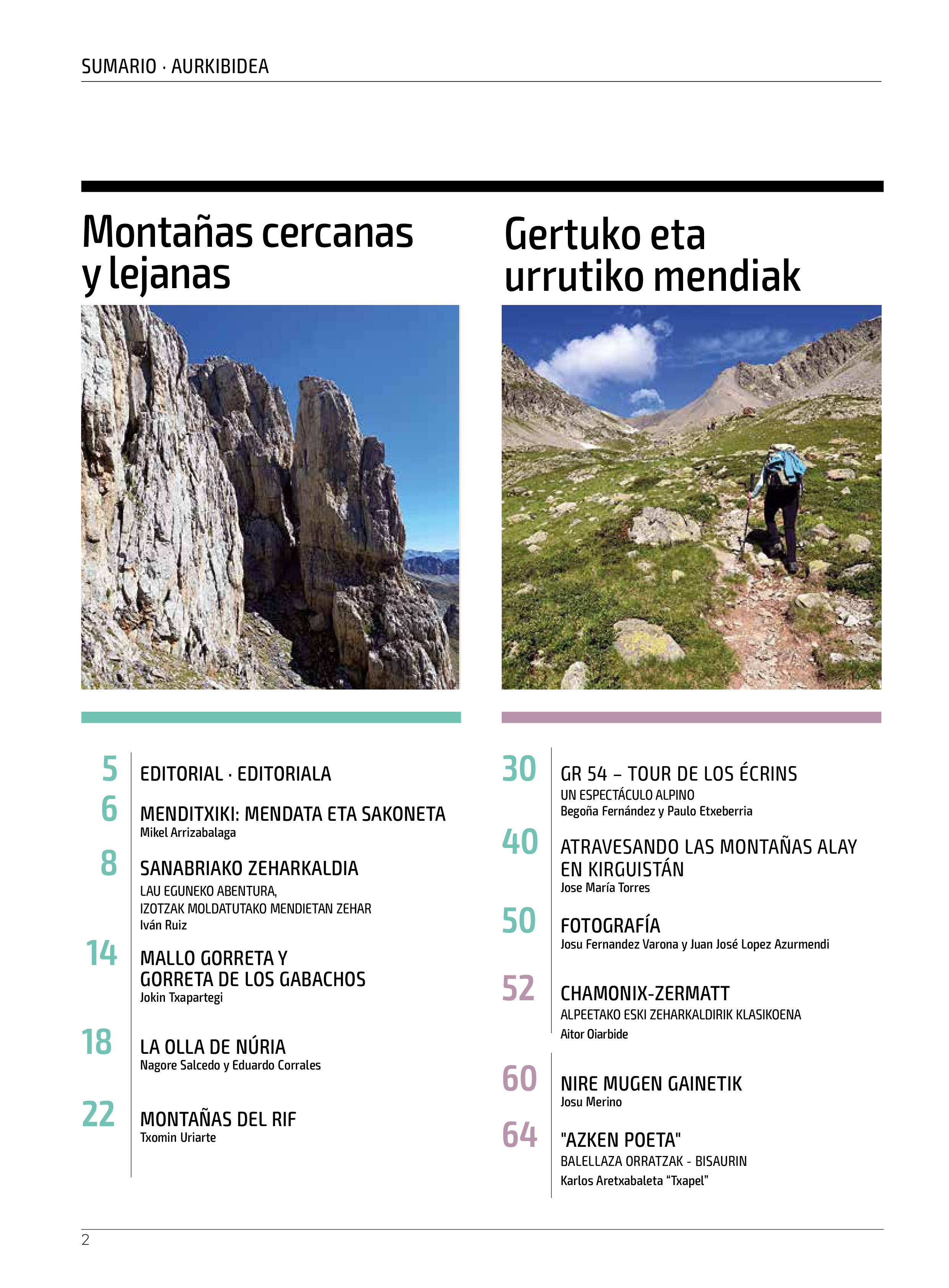 Gaiari helduz, ale honetan honako artikulu hauek proposatu ditugu: paseo bat Gipuzkoako kostaldeko flyschean, zeharkaldi bat Kantauriar mendikatean, hainbat igoera Aragoiko eta Kataluniako Pirinioetan, bidai bat Rifeko mendietara, zeharkaldi bat Écrins mendigunean, abentura bat Kirgizistanen, mendiko eskiko zeharkaldi klasiko bat eta eskalada-bide batzuk Alpeetan, eskalatzeari buruzko gogoetak, Geologiako eskola praktikoak Urkiolan eta mendizaletasunaren historia apur bat. Gainera, argazkigintza, albisteak, elkarrizketak, argitalpenak, ikus-entzunezkoak eta umore ukitu bat.