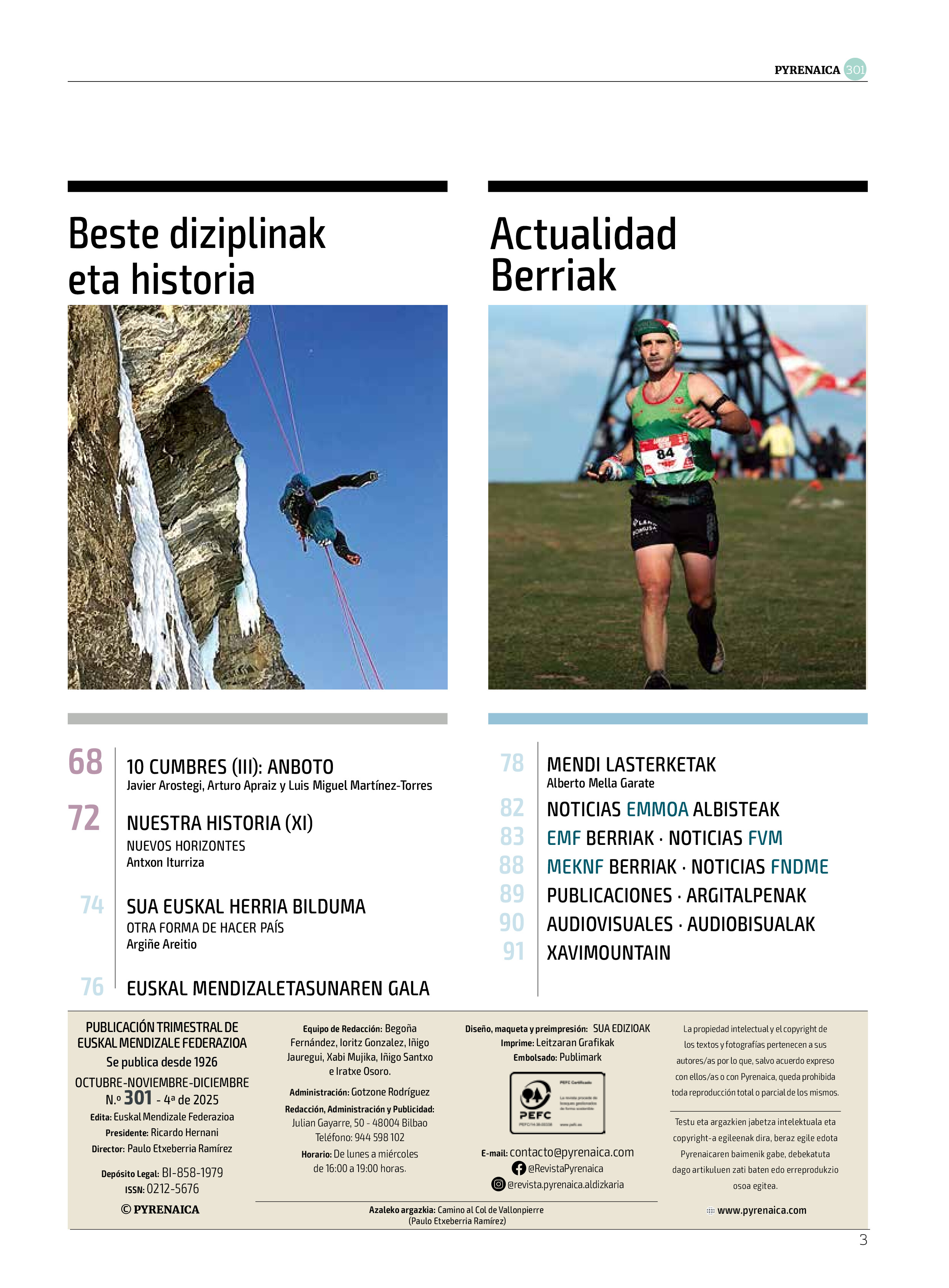 Mendi-hegal horretan, argitalpen honen sustatzaile den Euskal Mendizale Federazioak jarritako mugarriak ere presente daude. Zentzu horretan, gure presidente Ricardo Hernanik 298. aleko editorialean idatzi zuena aipatu nahiko nuke: federazioak, Pyrenaica barne, mendiko diziplina guztien alde lan egingo du eta arreta berezia eskainiko die eguneroko mendizaleei (esan genezake igandetik igandera dihardutenei).